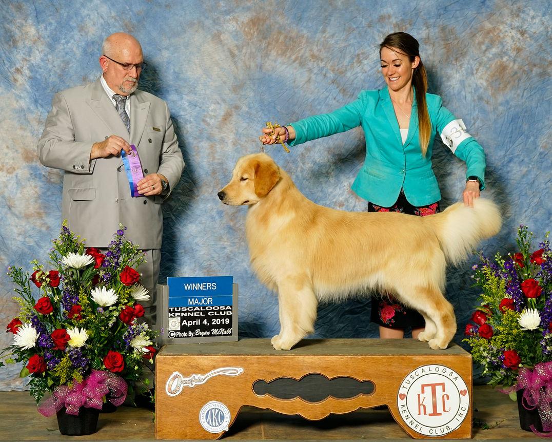 Tesla finished his AKC Championship in a flash! He finished with three majors! He is a very loving boy. He has a very gentle personality and loves being with his people. He is on the smaller size of the standard but a broad bodied boy. He is OFA EXCELLENT in hips! What a sweet face and boy! He has successfully produced an AKC Champion and many service and therapy working dogs. His sire was the number one ranked Golden when he was campaigned (Dylan). Telsa is an easy going spirit and loving dog.